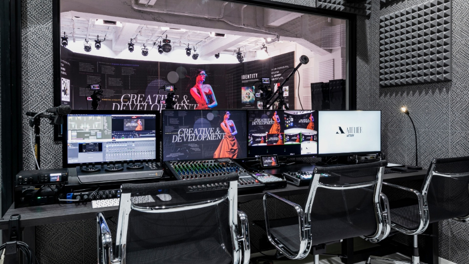 機材をつなぐだけのブースではなく、「現場を機能として支える頭脳」としての役割を果たすコントロールルーム。ATELIER ARTORYでは、映像・音声・照明をひとつの流れとしてマネジメントする制作現場を実現しています。