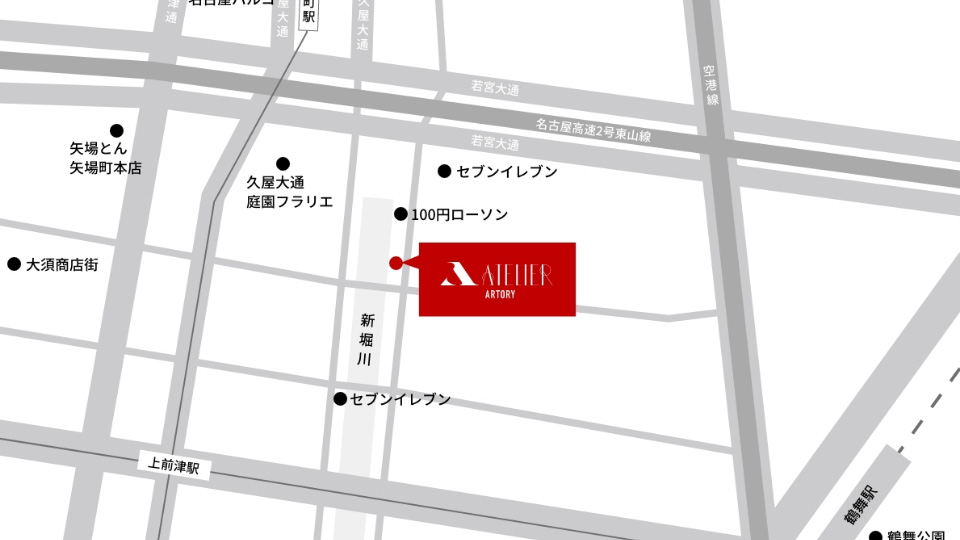 ATELIER ARTORYは、名古屋市中区の大須・上前津エリアに位置する撮影・配信対応スタジオです。地下鉄名城線「上前津駅」から徒歩約5分、若宮大通や大須観音通りにも近く、都心エリアでの制作において利便性の高い拠点としてご利用いただいています。